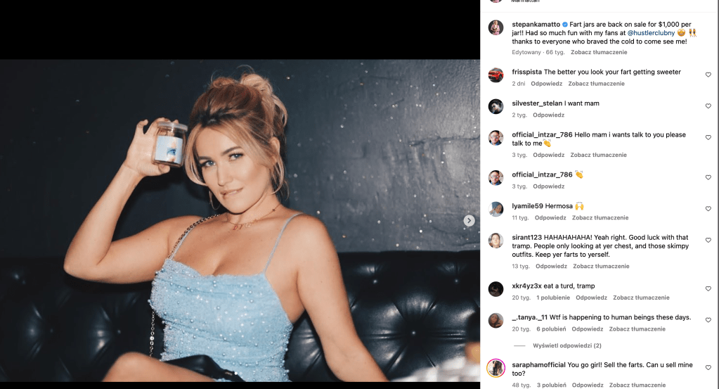 Prekursorką nowego stylu zarabiania na frajerach jest Stephanie Matto. Bardzo atrakcyjna blondynka, z pochodzenia Czeszka, gwiazda amerykańskiego show 90 Day Fiancé (90 dni na poślubienie Amerykanina), która sprzedawała facetom swoje bąki w słoiku.