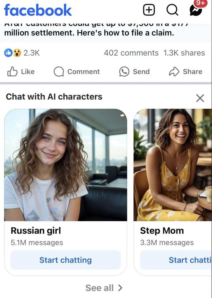 Meta twierdzi, że takie przykłady zostały usunięte, podobnie jak większość botów. Nadal jednak z nimi eksperymentuje. Na Fejsiku są czaty AI: „Russian Girl”, „Step Mom” albo „Granny Cougar”.