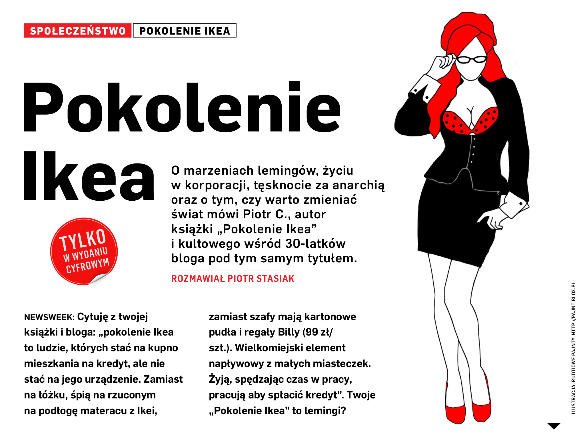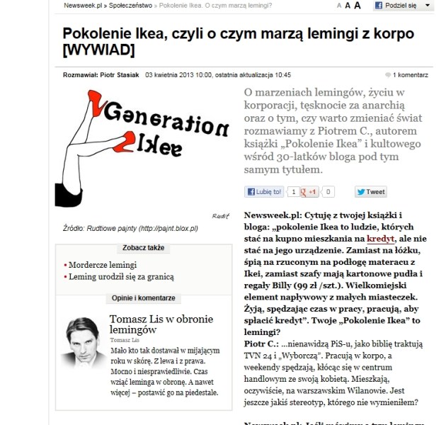 Newsweek: Cytuję z twojej książki i bloga: „pokolenie Ikea to ludzie, których stać na kupno mieszkania na kredyt, ale nie stać na jego urządzenie. Zamiast na łóżku, śpią na rzuconym na podłogę materacu z Ikei, zamiast szafy mają kartonowe pudła i regały Billy (99 zł /szt.). Wielkomiejski element napływowy z małych miasteczek. Żyją spędzając czas w pracy, pracują aby spłacić kredyt”. Twoje „Pokolenie Ikea” to lemingi?